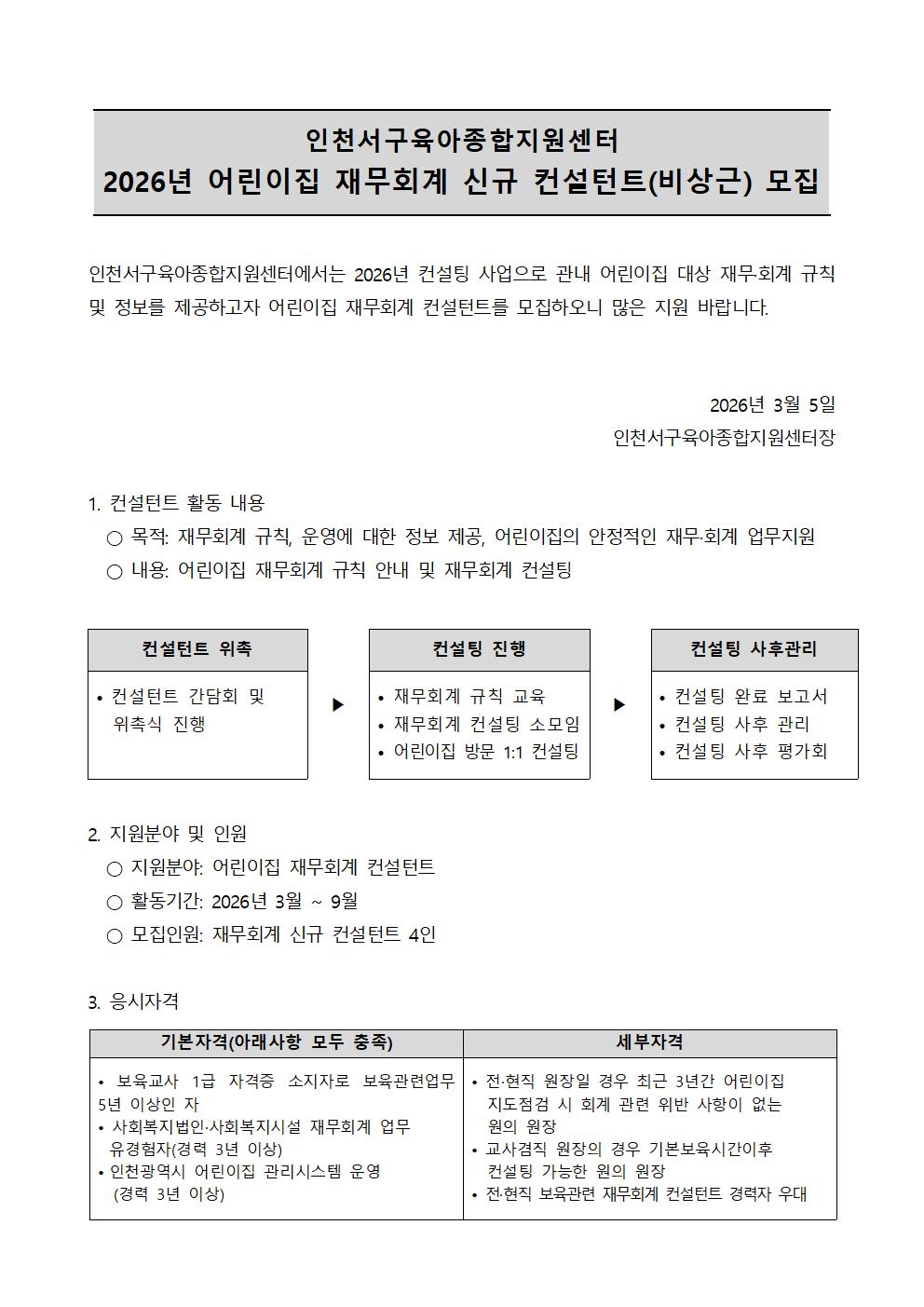 [º»¼¾ÅÍ]ÀÎõ¼±¸À°¾ÆÁ¾ÇÕÁö¿ø¼¾ÅÍ 2026³â ¾î¸°ÀÌÁý À繫ȸ°è ½Å±Ô ÄÁ¼³ÅÏÆ®(ºñ»ó±Ù) ¸ðÁý