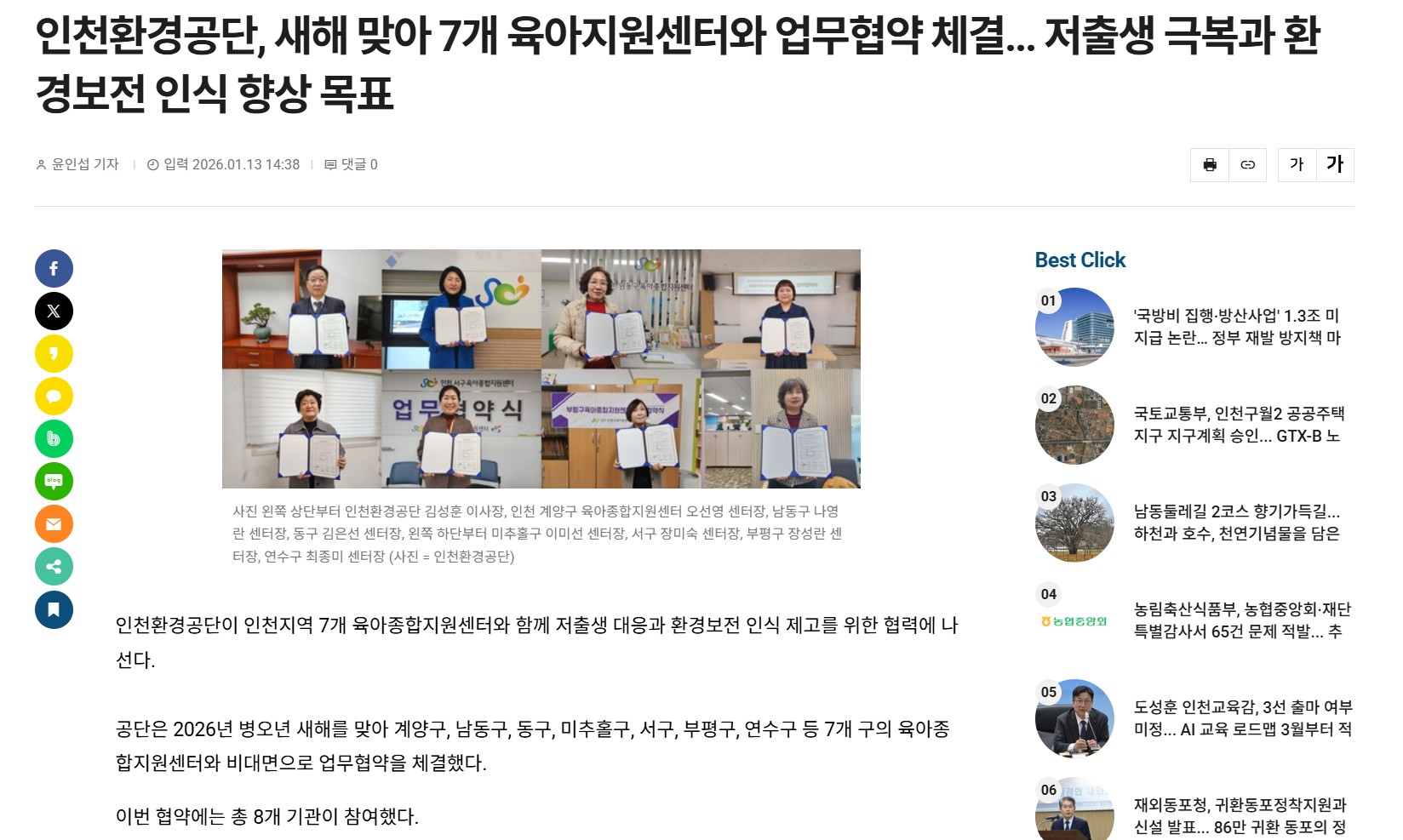 ÀÎõȯ°æ°ø´Ü, »õÇØ ¸Â¾Æ 7°³ À°¾ÆÁö¿ø¼¾ÅÍ¿Í ¾÷¹«Çù¾à ü°á... ÀúÃâ»ý ±Øº¹°ú ȯ°æº¸Àü ÀÎ½Ä Çâ»ó ¸ñÇ¥ < »çȸ < ´º½º < ±â»çº»¹® - Çѱ¹´º½º