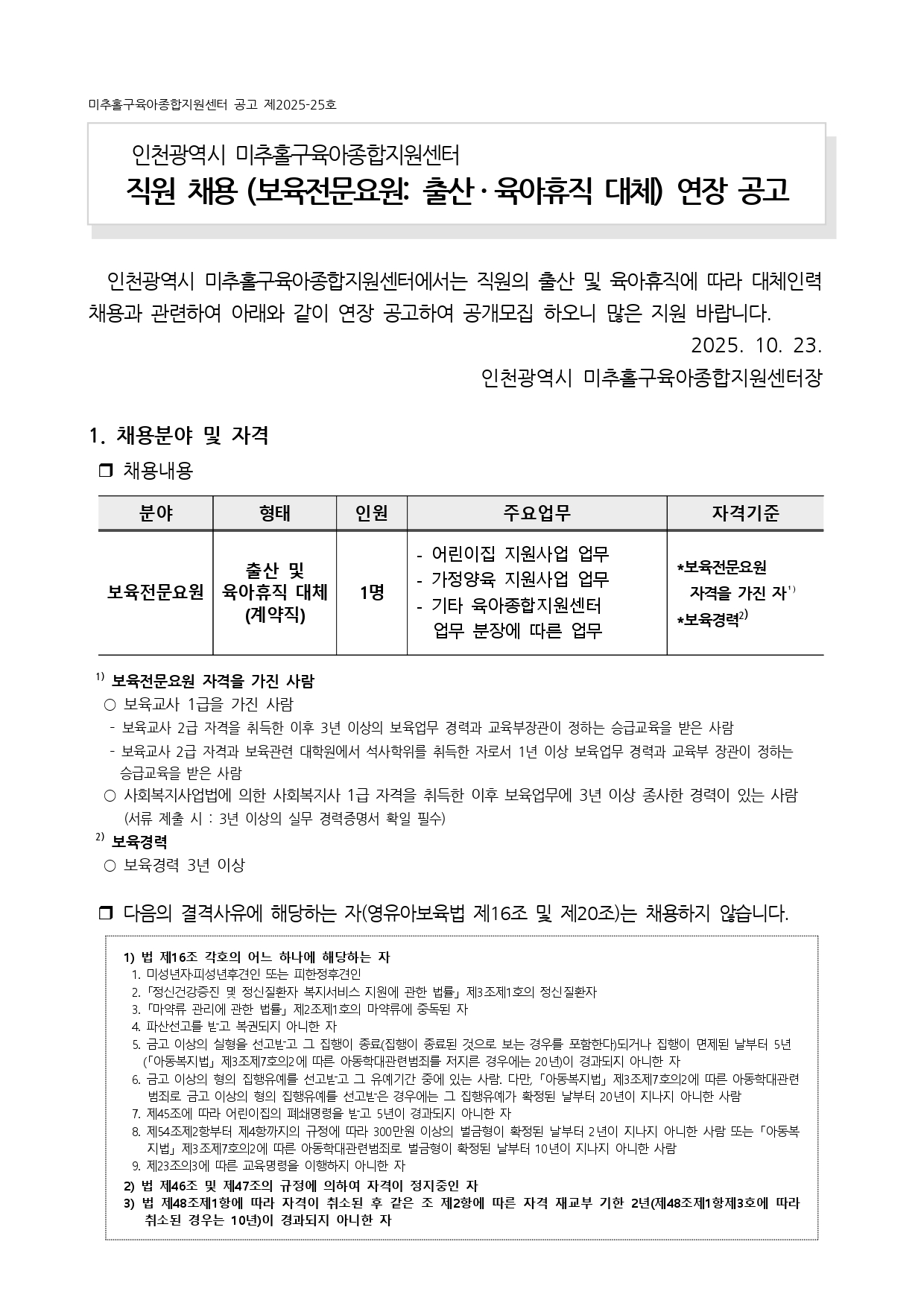 [ÀÎõ ¹ÌÃßȦ±¸À°¾ÆÁ¾ÇÕÁö¿ø¼¾ÅÍ] Ãâ»ê ¹× À°¾ÆÈÞÁ÷ ´ëüÀη ä¿ë °ø°í