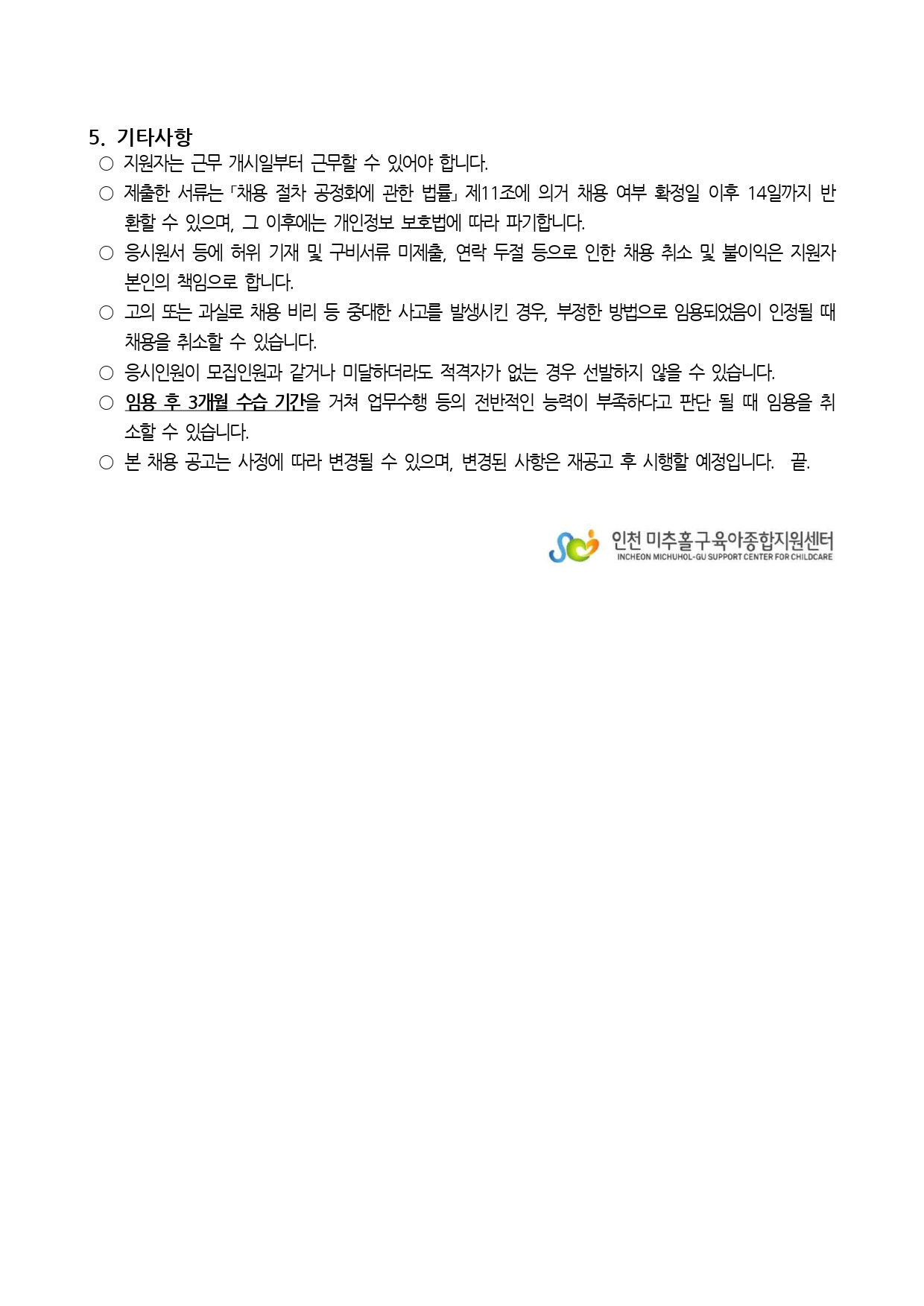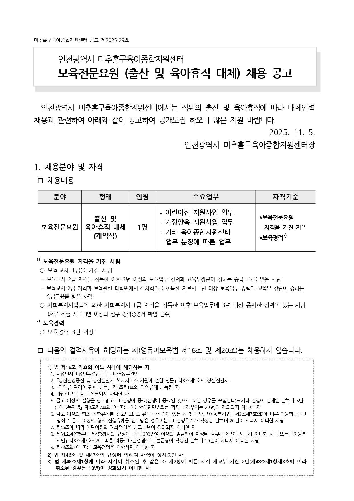 [ÀÎõ ¹ÌÃßȦ±¸À°¾ÆÁ¾ÇÕÁö¿ø¼¾ÅÍ] º¸À°Àü¹®¿ä¿ø(Ãâ»ê ¹× À°¾ÆÈÞÁ÷ ´ëü) ä¿ë °ø°í