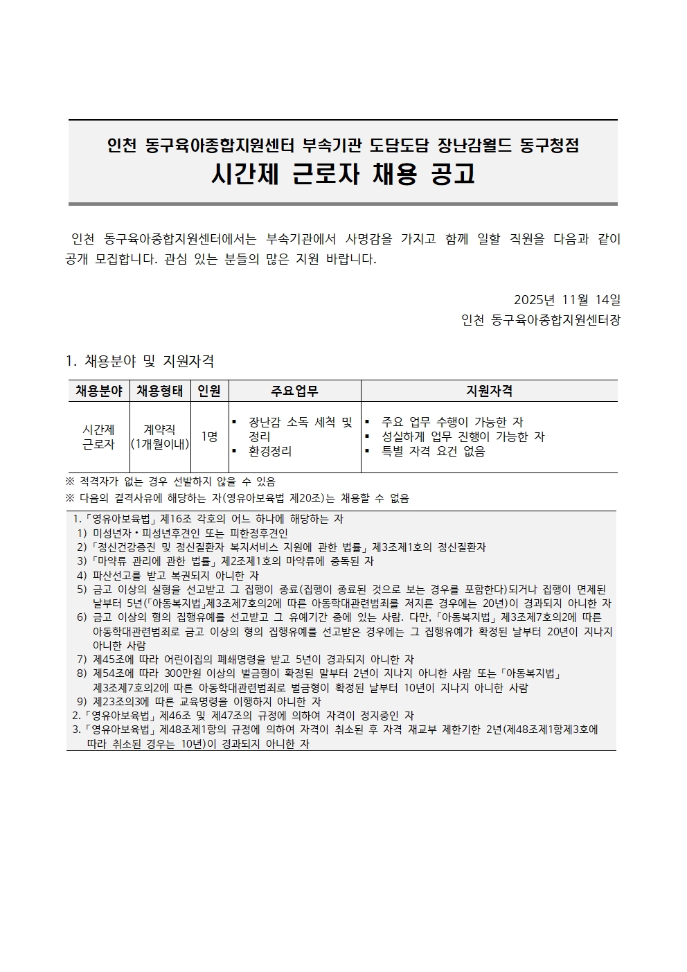 [ÀÎõµ¿±¸À°¾ÆÁ¾ÇÕÁö¿ø¼¾ÅÍ] µµ´ãµµ´ã Àå³°¨¿ùµå µ¿±¸Ã»Á¡ ½Ã°£Á¦±Ù·ÎÀÚ Ã¤¿ë