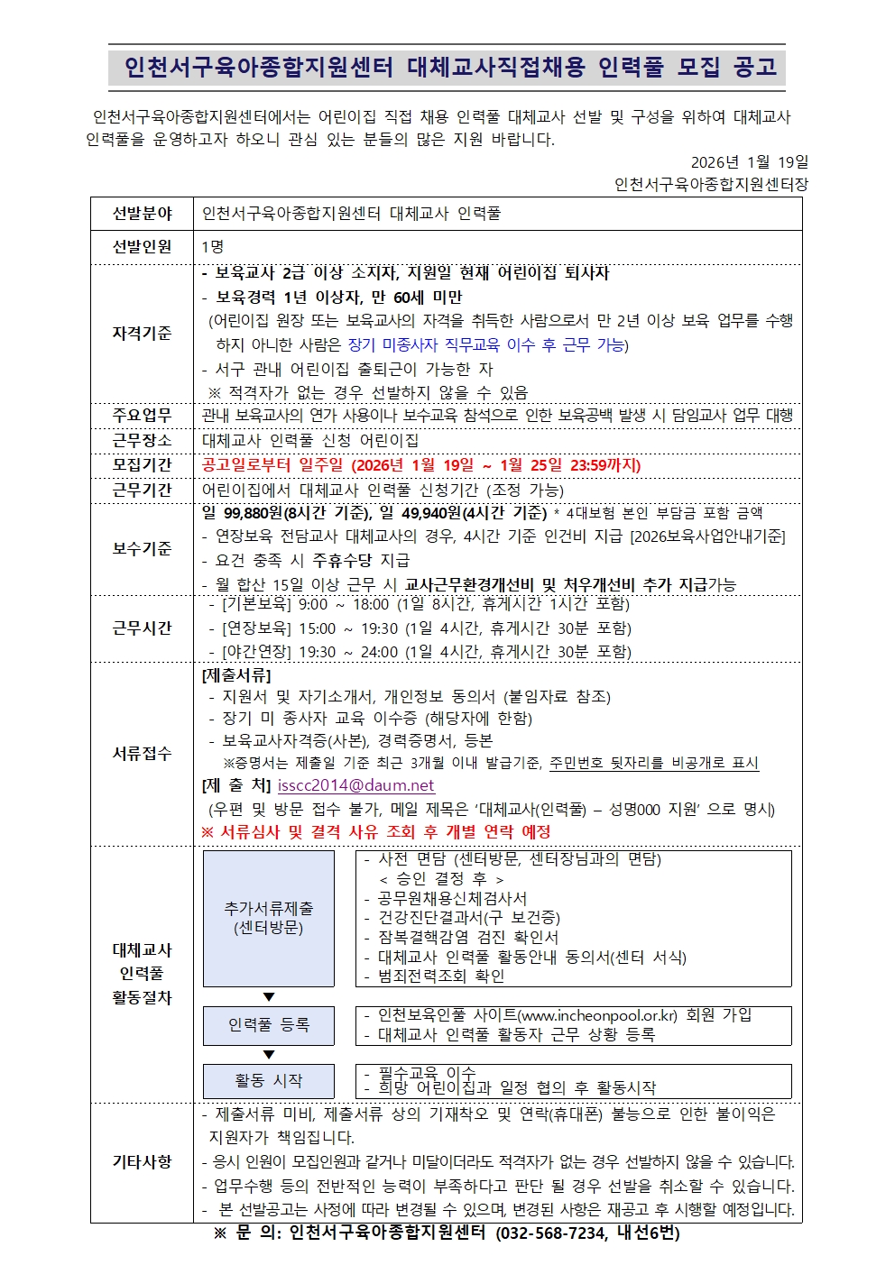 [º»¼¾ÅÍ] ÀÎõ¼±¸À°¾ÆÁ¾ÇÕÁö¿ø¼¾ÅÍ ´ëü±³»ç Á÷Á¢Ã¤¿ë ÀηÂÇ® ¸ðÁý °ø°í