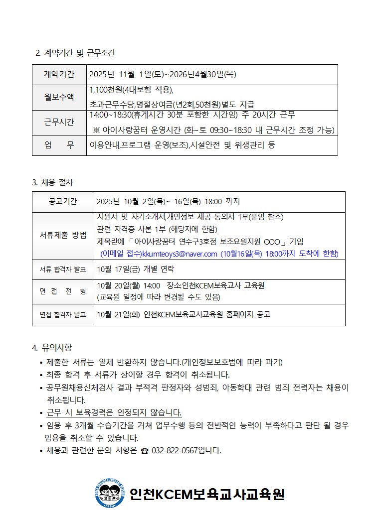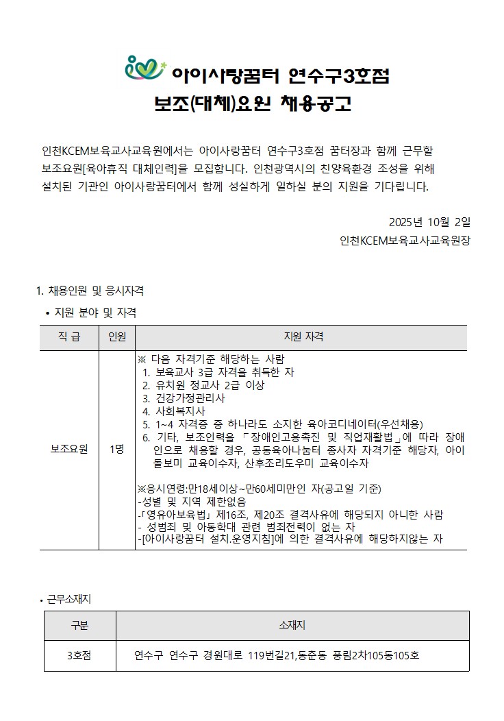 [ÀÎõ¿¬¼ö±¸À°¾ÆÁ¾ÇÕÁö¿ø¼¾ÅÍ] ¾ÆÀÌ»ç¶û²ÞÅÍ ¿¬¼ö±¸3È£Á¡ º¸Á¶(´ëü)¿ä¿ø ä¿ë°ø°í
