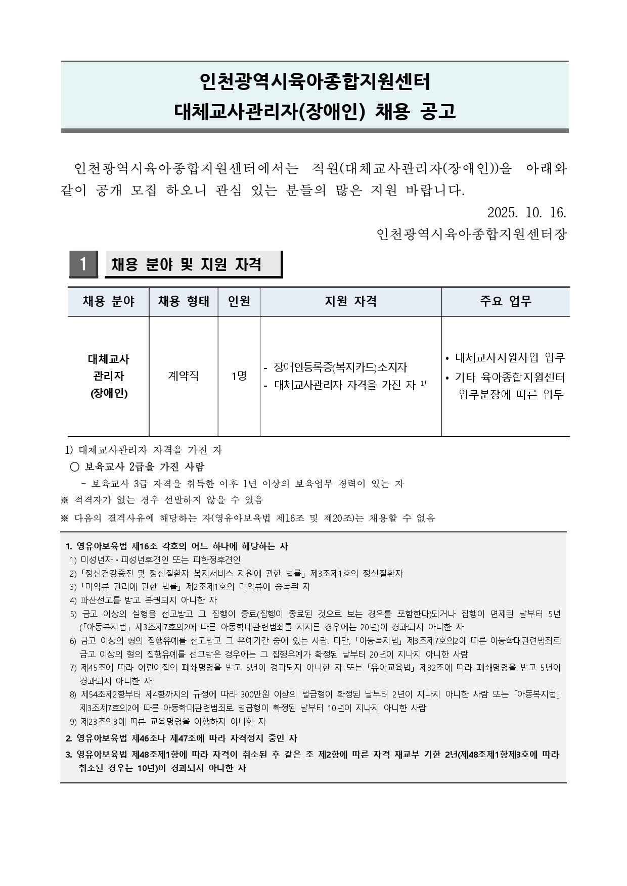 [ÀÎõ±¤¿ª½ÃÀ°¾ÆÁ¾ÇÕÁö¿ø¼¾ÅÍ] ´ëü±³»ç°ü¸®ÀÚ(Àå¾ÖÀÎ) ä¿ë °ø°í
